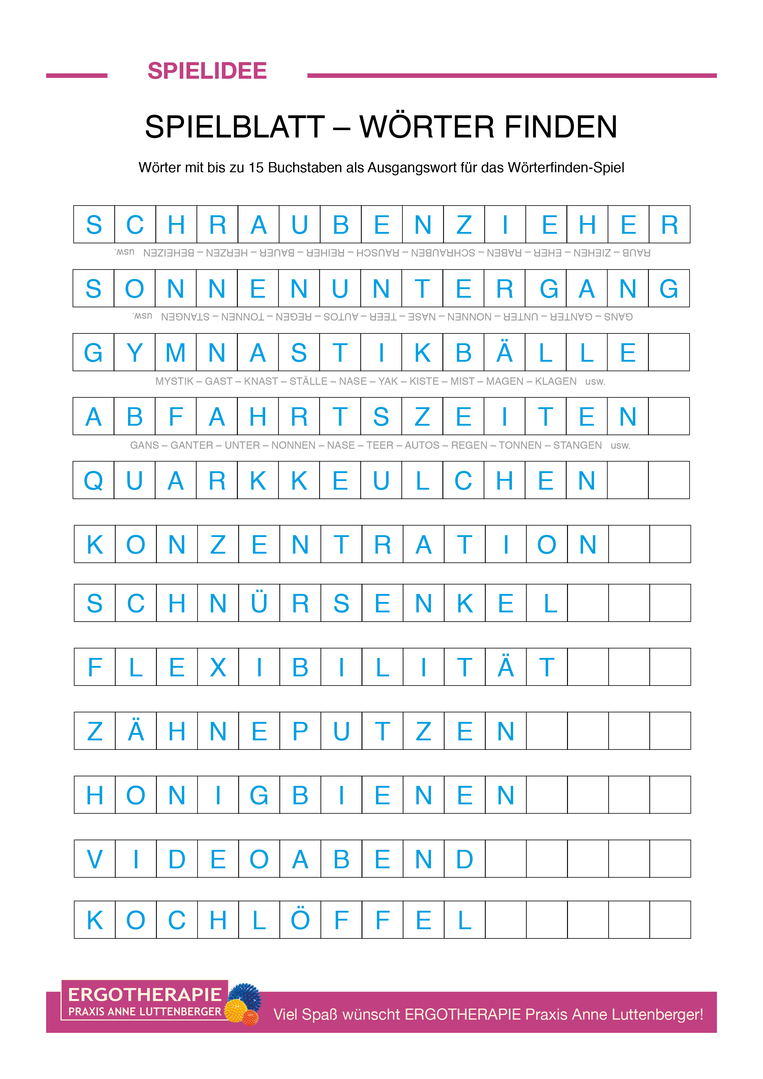 Wie geht's? Aus den Buchstaben eines langen Wortes möglich schnell eine bestimmte Zahl neue Wörter bilden.Es gibt mehrere Spielversionen: Wer die meisten oder am schnellsten eine bestimmte Zahl an Wörtern findet, die zum Beispiel je nach Wortlänge mehr oder weniger Punkte bringen. Hier findet Ihr die Anleitung, ein Spielblatt 1 mit Ausgangswortvorschlägen, ein leeres Spielblattt 2 für eigene Ausgangswörter und – für den Fall der Fälle – Wörter für die Lösungen zum Spielblatt 1. DOWNLOADAnleitung